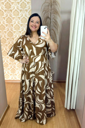 Vestido Plus Size Heloísa Viscose Marrom e Bege Estampado G2 G3Vestido Plus Size Heloísa Viscose Marrom e Bege Estampado G2 G3