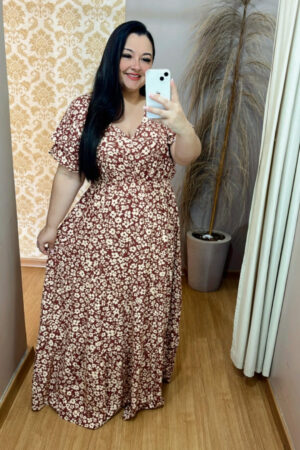 Vestido Longo Plus Size Thais Bordo Estampado Viscose G1 G2