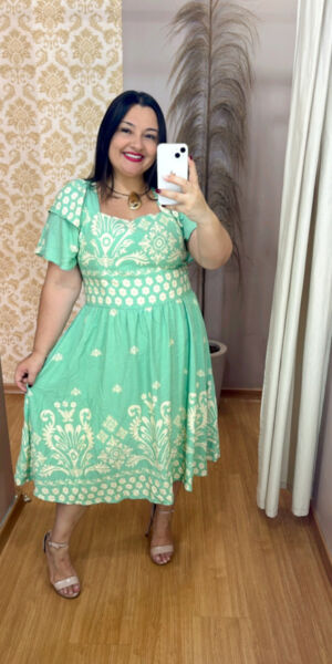 Vestido Midi Plus Size Eloah Verde Estampado G2 G3